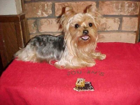 The hair should be long, silky, straight and cool to the touch. It should be dark steel blue on the body and three shades of gold on the head and legs. This is basically the description of the perfect Yorkie coat. . Unfortunately, all Yorkies are not perfect. What I'd like to do here is address all types of coats. We as breeders always strive for perfection, but there are always throwbacks to some ancestor long forgotten. . We sell these puppies because we can't use them in our breeding program and can't show them. They usually go to a pet home where they are just loved for themselves. The problem is, most of these pet home Mommies or Daddies have no idea what to do with the coat of their pet puppy even if it is perfect. . I have been showing and breeding for many, many years and have encountered many different kinds of coats. I will try to give you my advice on the different coats that I have run across. . Understand that I am not perfect. If anyone reading this has a better idea on how to take care of a particular kind of coat, I will be glad to hear from them and will be glad to use their ideas on my page. . Don't send me any "secret formulas" because they will not be secret for long. I believe in helping everyone, not just keeping all the good stuff to myself. This article contains the products that I use and have found works for me. . There are many different varieties of coats, but I am just going to discuss the three main ones. From these three you should be able to develop your own formula for your particular kind of coat. . The first coat is the "perfect" coat. As I talk about this one I will give you step by step instructions on the care of not only the coat but the whole Yorkie. Most of these steps should be applied to all Yorkies, what ever kind of coat they have. In the next two kinds of coats I will point out the things to do differently. . First is to make sure your Yorkie is flea free. One flea on a Yorkie will ruin the coat. They scratch and make a tangled mess of them- selves and Mommy or Daddy usually has to cut them down in some kind of puppy cut. . There is nothing wrong with a pupp made by Ring 5. It is a lusterizer, conditioner. I spray it on my brush (a Mason Pearson nylon 7 inch) and brush one section of the coat at a time. Another good spray product is "Miracle Coat". . Always start from the bottom of the hair strand and work upward toward the body. If you encounter any mats along thy cut. Mine are cut down after I show them so they can be more comfortable and me too. But this article is mostly for those who want all the hair and are willing to sacrifice the time and patience to grow it and keep it looking beautiful. . There are many new kinds of flea control on the market now and if used, will work. I use front line in the summer once a month and then use the non toxic spray for the winter. . I live in the south and here the flea's are as big as our alligators. You can find the home page for the non toxic spray on my Yorkie links page. It really works and it smells good. I also spray my home and yard (any commercial spray) once a month in the summer and every three months in the winter. I also use the non toxic spray for bedding, puppies and my pregnant bitches. . A good brushing every day is essential. You know what you would look like in a week if you didn't brush your hair everyday. "Egad". . Never brush a dry coat. It breaks hair. I use "Coat Gloss"e way, use a pin brush (P.S.I. 25249) to get them out. You can also use a slicker brush (any small one) for the really tough mats. I usually only use the slicker on puppies. . Don't use the slicker on the thin coated dogs. Instead use a wide tooth metal comb. .. Any mat or knot should be treated gently. Don't rip through the hair. Gently pick as much apart with your fingers as you can and work from the ends up to get the mat out. . If you are wondering where to get all the products and tools that I use, I will post the name and address of the supply company that I use at the end of this article. They will accept credit cards, money orders or what ever and will ship. They are venders at the shows that I go to. You should be able to find a show in your area. The vendors are great places to spend lots of money. :) Some of the products have a link to a supply company that sells them as my vendors don't carry them. . I believe in the weekly bath. Some breeders I know say every two weeks. I think it depends on your Yorkie. If he's dirty, bathe him. Some of my "mud puppies" get two a week. . The worse thing next to fleas for the coat is dirt. First I brush him until all the tangles are out. Pay particular attention to under the arms, legs, neck and behind the ears. . I use an ear cleaning solution (any brand) in their ears and gently with a q-tip clean them out. If there is any hair in them, this should be removed. A hemostat works great but you can also use tweezers. Too bad if you're squeamish. Those hairs have to go or your pup could get an ear infection. (Squeemies see your Vet). Also I treat for ear mites once every three months, just as a precaution. . Next check toenails. If they are too long, cut them. I know, you're gonna say "but what if I make them bleed?". There is a product called "Quick-stop". If they bleed: First, "don't panic". Second, just dab a little Quick-stop on the toenail and it stops the bleeding right away. You can also use it on yourself for the teeth marks your Yorkie left on you for cutting his nails too short. A good guide is the curve in the nail. I hold the clippers flat against the upper part of the nail and whatever curves down into the clippers gets cut off. Buy the ones for cats. They're smaller. The next thing I do is check their teeth. Can't stand "Pee Yuu" breath. I brush their teeth before every bath. I use the toothpaste I get from my Vet., and a baby toothbrush. Sometimes they get built up tarter and I use one of those teeth cleaning tools I get from my supplier and scrape them c